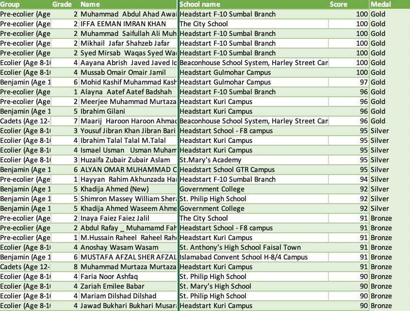 After a careful evaluation of the results from all participating schools, the Illumined Minds board has decided to exclude 9 schools from the competition, due to the high number of identical answer sheets. All schools having 75% of students in the same age group with the same score or within a set of at most two score values, have been disqualified.